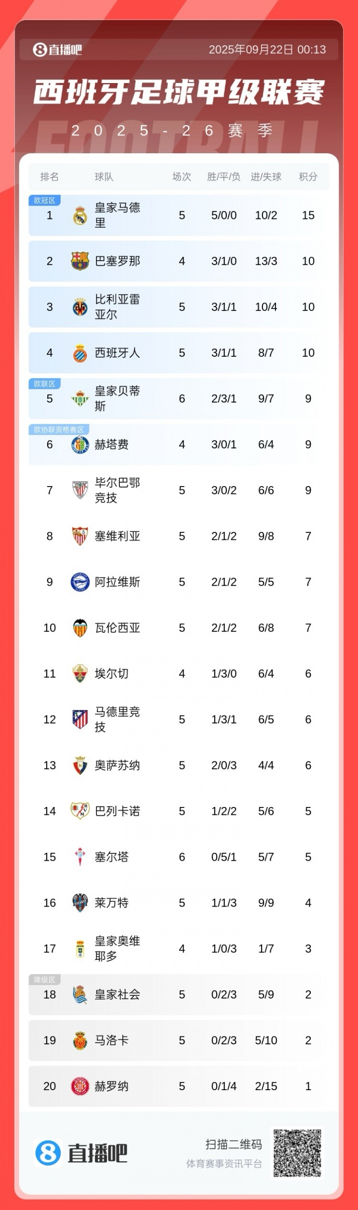 9月22日訊 今日西甲馬德里競技客場戰平馬洛卡,最新西甲積分榜如圖。凌晨三點巴塞羅那將對陣赫塔費。