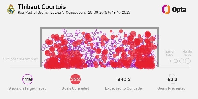 Opta指出,2018-2019賽季庫爾圖瓦加盟皇馬以來,預(yù)期失球340.2粒,而去掉烏龍球的實際失球為288粒,這意味著庫爾圖瓦阻止了52.2粒失球,五大聯(lián)賽門將同期最多。