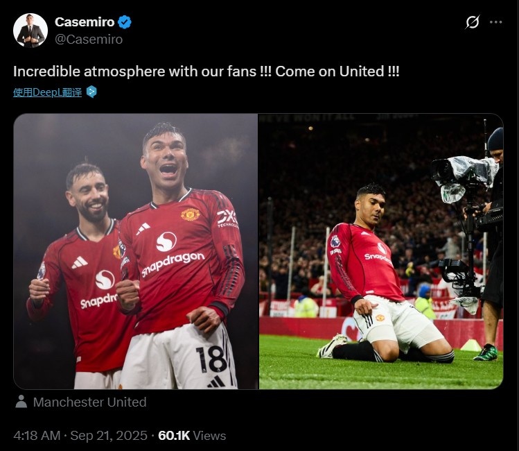 卡塞米羅曬出自己的賽場照,并配文:球迷們營造的氛圍簡直太棒了!!!加油曼聯(lián)!!!