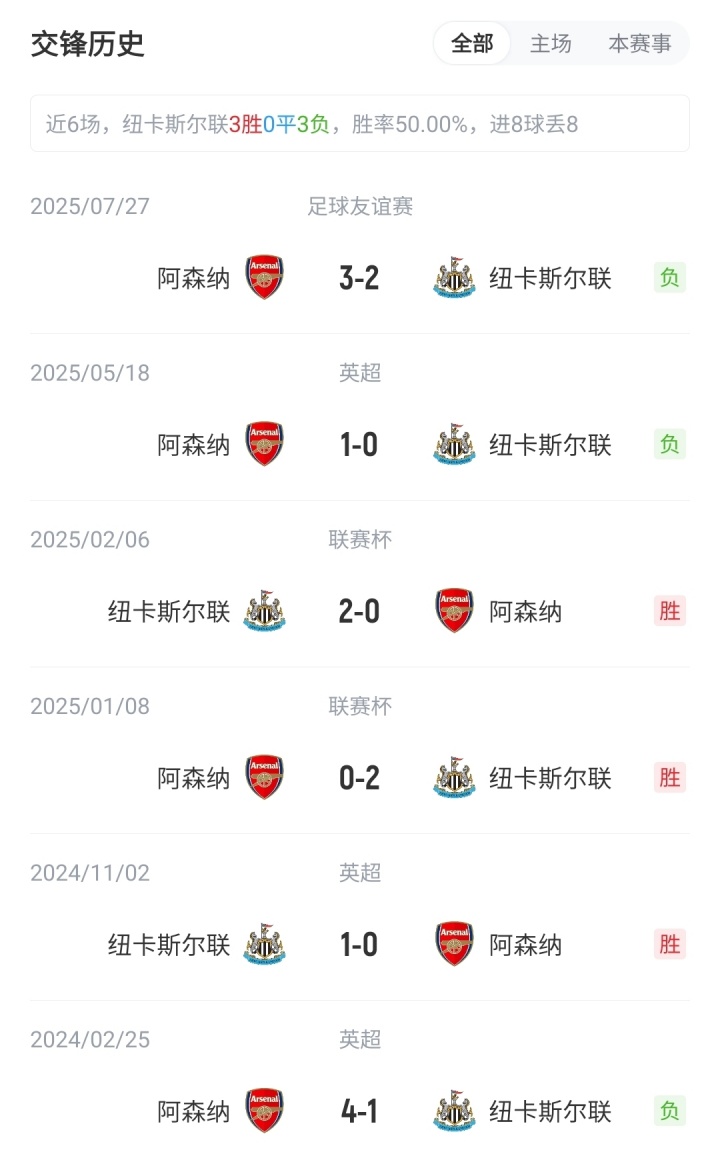 目前英超積分榜上,紐卡1勝3平1負積6分,位列第15;阿森納3勝1平1負積10分,位列第7。