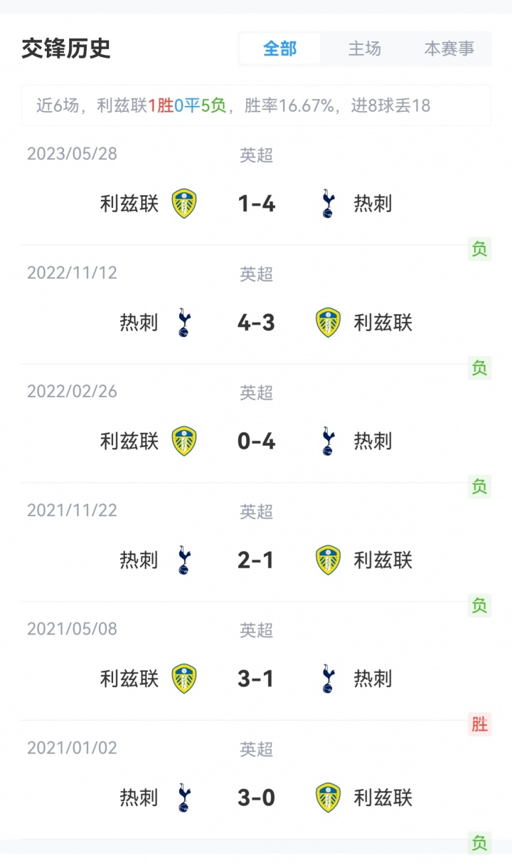 利茲聯(lián)2勝2平2負(fù)積8分,排名英超第12;熱刺3勝2平1負(fù)積11分,排名英超第5。