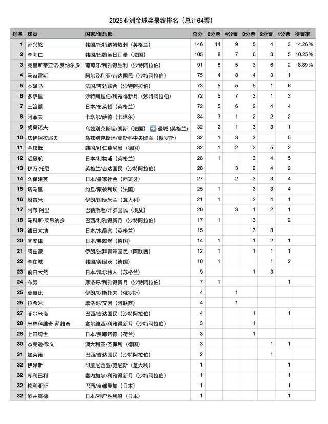 10月13日訊 《體壇周報(bào)》公布2025亞洲金球獎(jiǎng)投票結(jié)果,孫興慜146分第10次奪魁,李剛?cè)?05分排名第二,C羅91分排名第三。