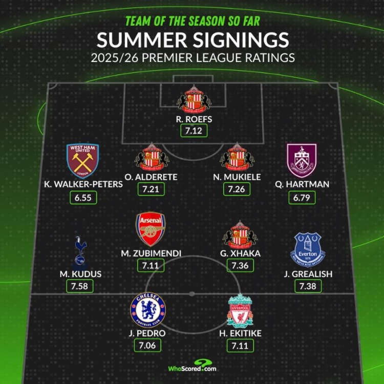 10月14日訊 英超7輪戰(zhàn)罷,WhoScored評出了由今夏新援組成的最佳11人陣容,四名桑德蘭球員入選(數(shù)據(jù)為聯(lián)賽數(shù)據(jù))。