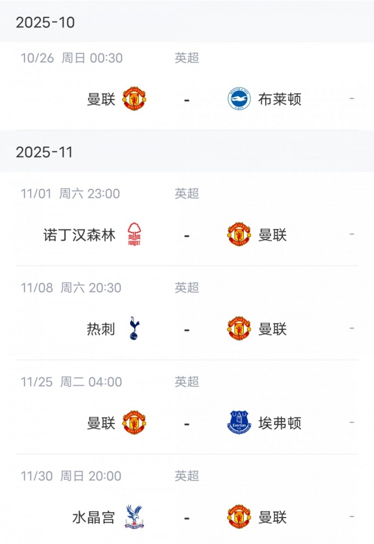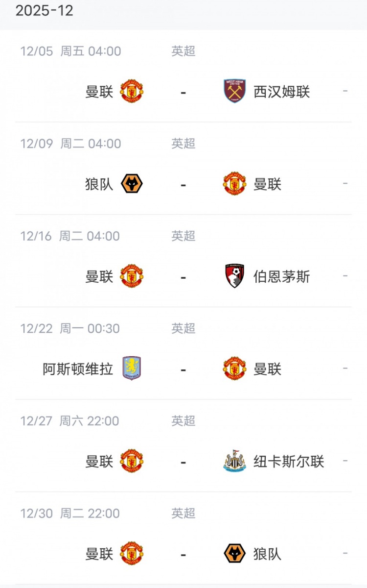 曼聯是唯一一支在圣誕節前連續進行三場周中英超比賽的球隊:12月4日周四主場對西漢姆聯,隨后周一客戰狼隊,接著再過幾天主場迎戰伯恩茅斯。此外,原定12月27日周六主場對紐卡的比賽也可能被移至節禮日晚間進行。