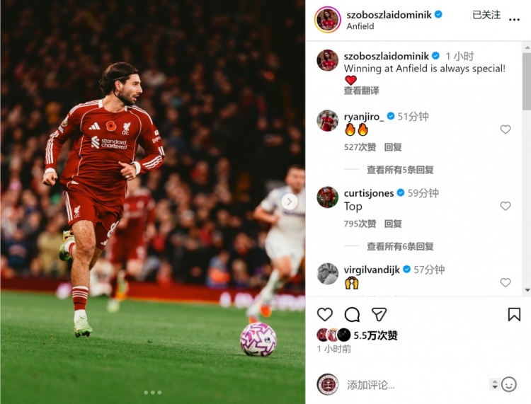 索博斯洛伊當選利物浦隊內最佳球員,他在社交媒體上慶祝勝利:“在安菲爾德取勝總是很特別。”