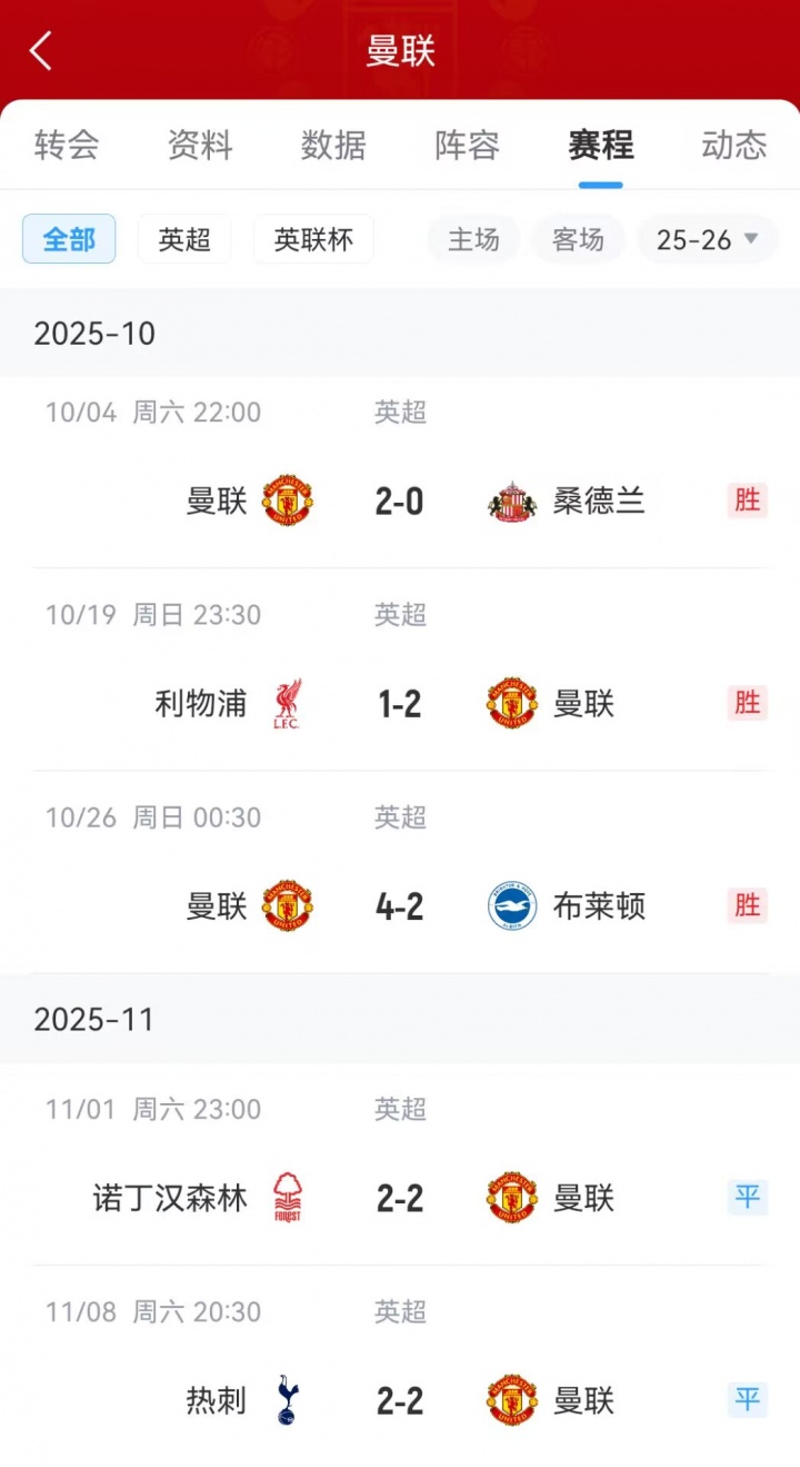 最近的五輪聯賽中,曼聯一度接連戰勝桑德蘭、利物浦、布萊頓,取得三連勝;上輪聯賽2-2戰平森林。本輪對陣熱刺的比賽,曼聯在全場補時階段被反超的情況下,由德里赫特打進了絕平的進球,從客場帶走一分。