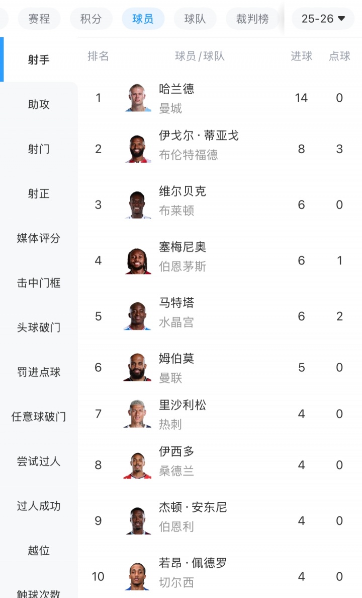 英超進行到第11輪,哈蘭德14球領跑射手榜,領先第二名的伊戈爾·蒂亞戈6球。