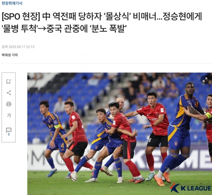 09月17日訊 亞冠精英聯賽東亞區第1輪,成都蓉城客場1-2不敵蔚山HD,賽后韓媒spotv聲稱,有中國客場球迷朝韓國球員鄭升炫投擲水瓶。
