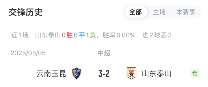 目前,山東泰山12勝6平7負積42分位列中超第6,近6輪比賽泰山4勝2平保持不敗;云南玉昆8勝7平10負積31分位列中超第10,球隊近期3負2平連續五輪不勝。本賽季雙方首回合比賽,泰山遭玉昆讓二追三逆轉。